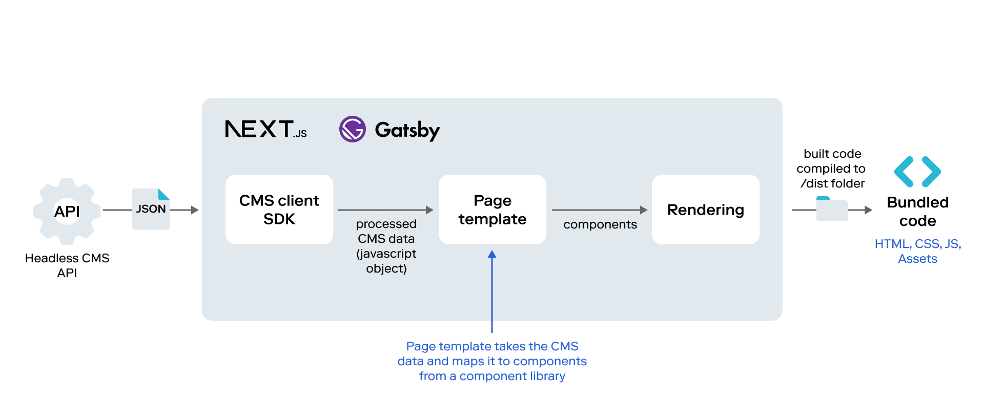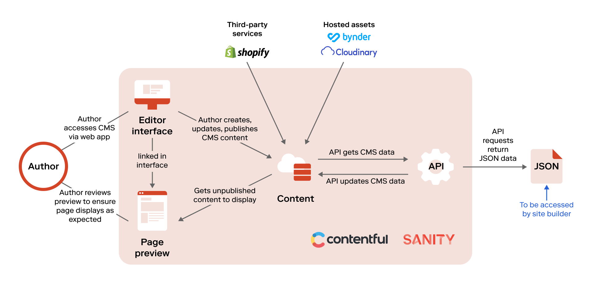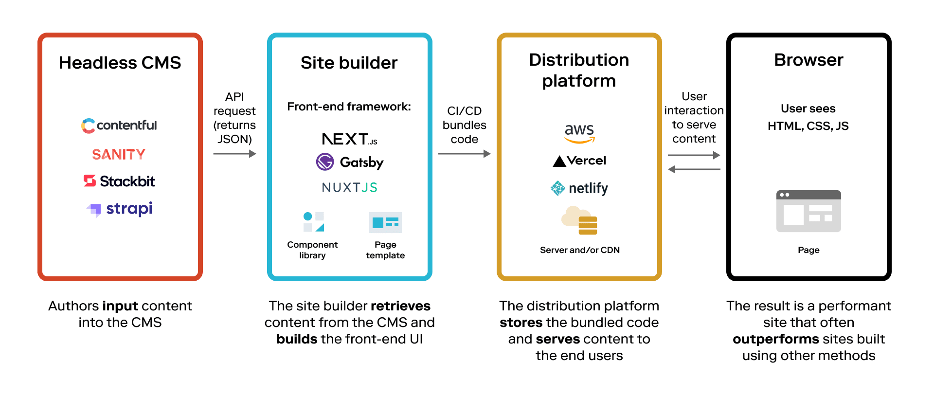 Authors input content into the CMS; the site builder retrieves content from the CMS, in the form of JSON, and builds the front-end UI; and the distribution platform stores the bundled code and serves content to the end users.
