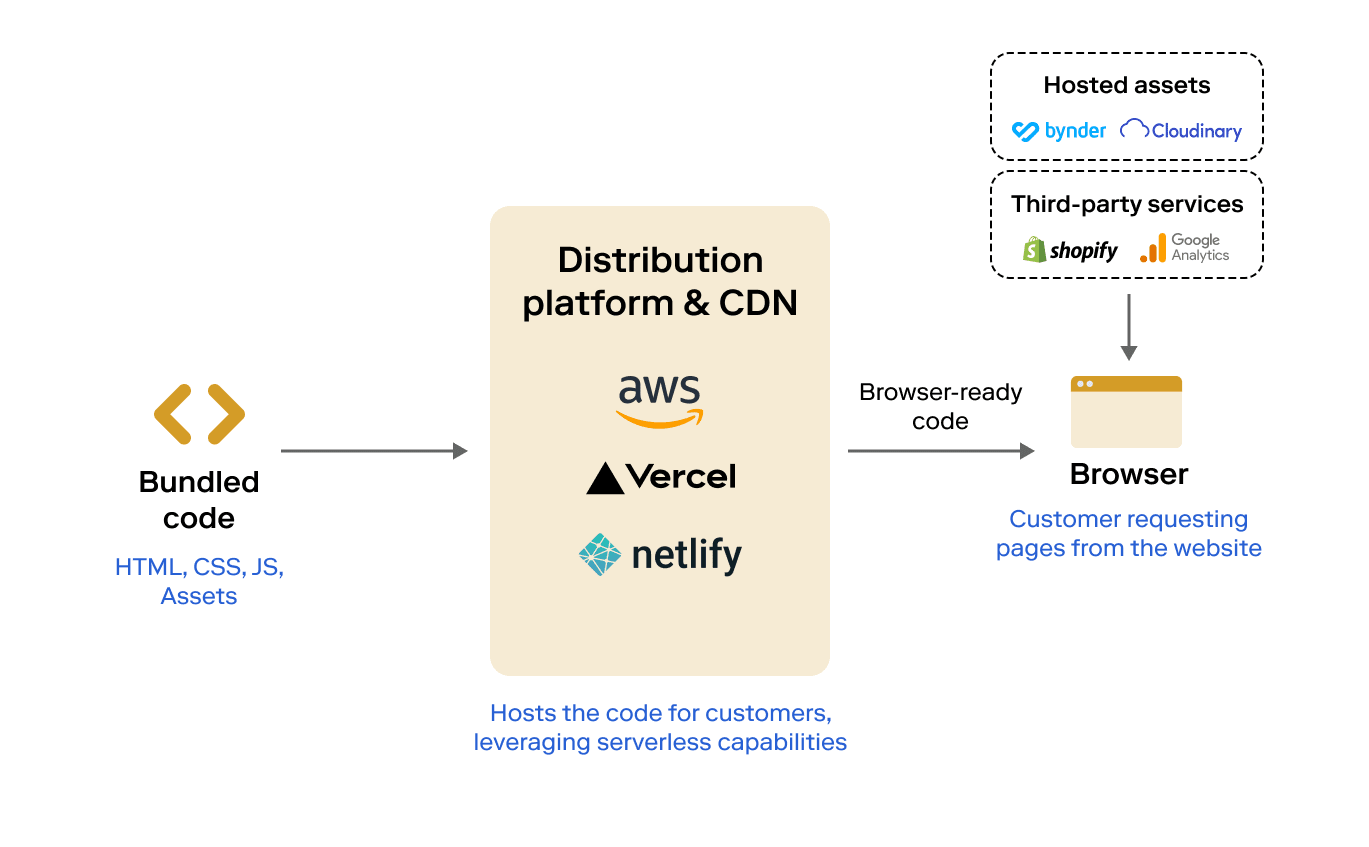 A distribution platform is a system that takes the bundled code (generated by a site builder) and makes them available to end users on their browsers. This is typically achieved by publishing the code and assets to a space where they can be accessed publicly.